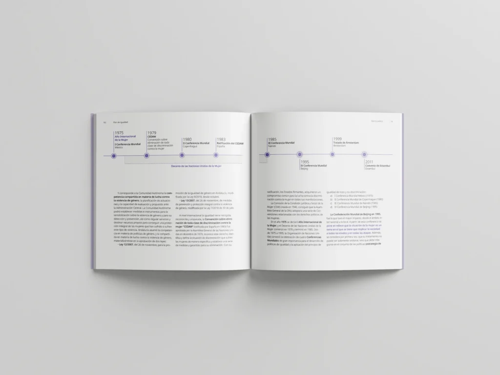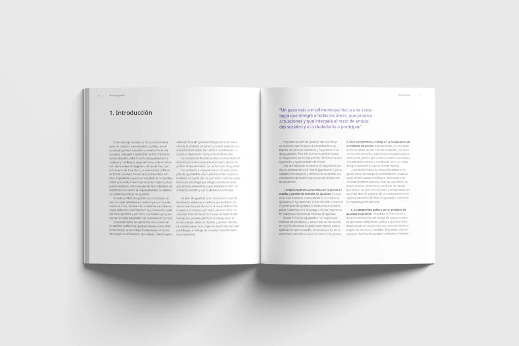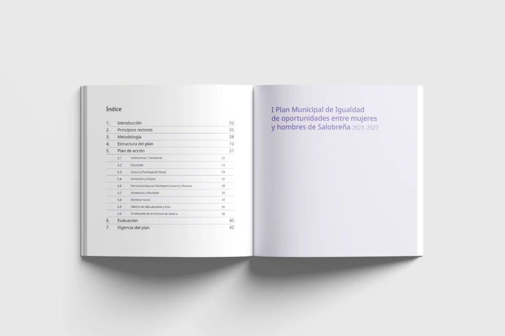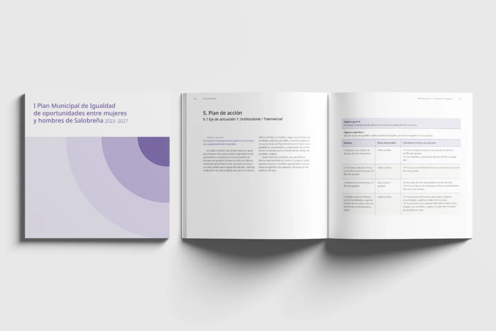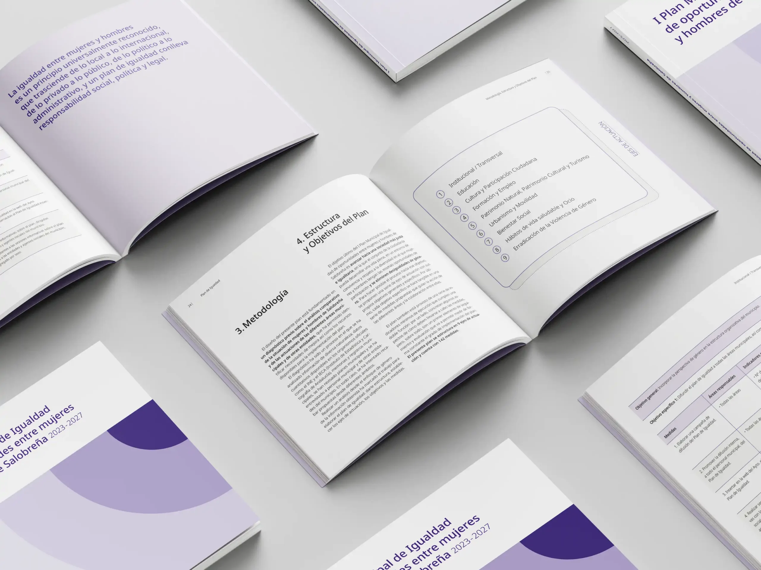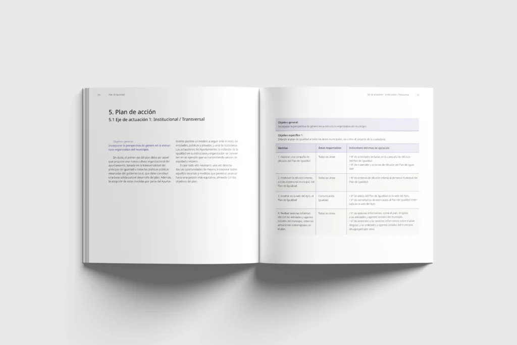 Para ello, trabajaremos en un diseño funcional que facilite la navegación y lectura, con especial atención a la estructura del documento, trabajando a partir de la identidad del Plan y Área de Igualdad.